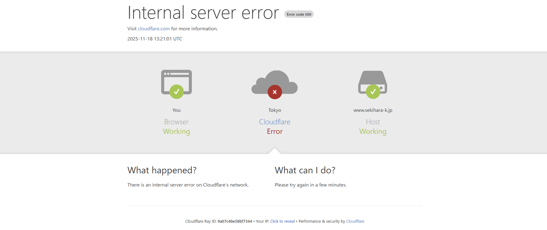 このエラーは、当サイトが使用しているCDNサービス、Cloudflareの一時的な通信障害によるものであると考えられます。